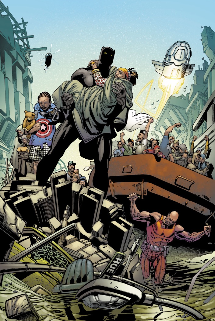 In that four issue story Hudlin goes black superhero crazy, teaming T’Challa up with Luke Cage, Falcon, Blade, Brother Vodoo and the former Captain Marvel, and it’s all kinds of awesome. Luke Cage’s everyman street-level superhero status is a great foil to the high and mighty Black Panther, whether they’re talking at a dance club or fighting endless waves of ninjas. Eventually the pair head down to New Orleans to help with the Hurricane Katrina relief effort and run afoul of some newly awakened vampires. I’d never read a Blade comic but as a big fan of the first two movies it was incredibly fun to see Blade kicking vampire ass in his own anti-social way.