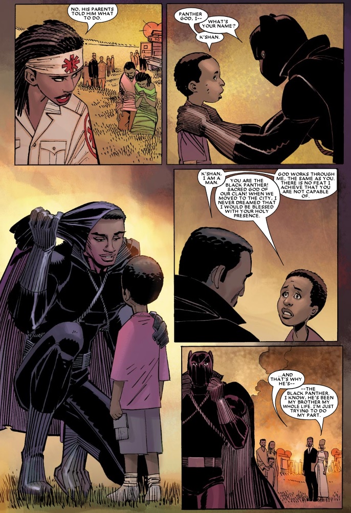 The first six issues, collected as “Who is the Black Panther,” are written as a psuedo-origin story and introduction to the character. We get lots of background information on Wakanda as a fiercely independent warrior nation that’s never been conquered. The Black Panther is less a man and more of a mantle to be worn by the most powerful Wakandan, though it seems to primarily pass though the same bloodline.