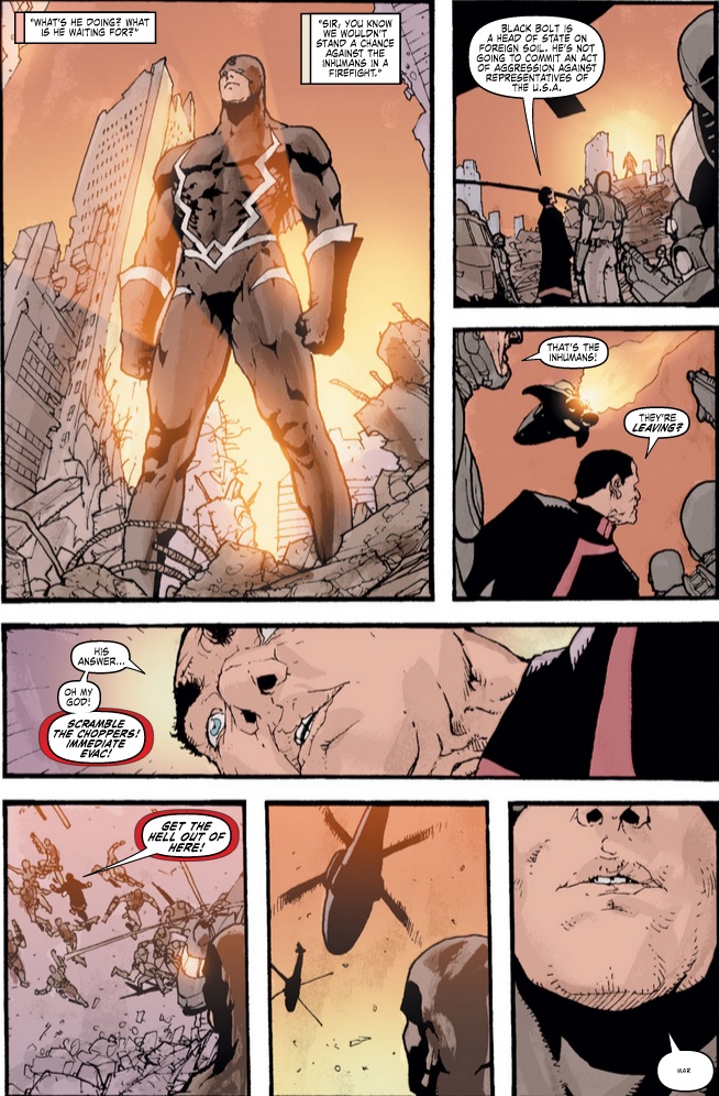 Of course the Inhumans weren’t going to stand idly by, and they reach Genosha around the same time as the Office of National Emergency. The Inhumans battle the Genoshan mutants and promptly kick their ass, while the O*N*E take down Quicksilver and grab the mists. The final confrontation occurs as the Inhumans demand the Mists returned and the US government refuses. In a rather awesome scene, Medusa says that Black Bolt will give his answer shortly, and the rest take off. The O*N*E commander starts freaking out, for Black Bolt’s voice is so powerful he can never speak lest he destroys everything around him. He whispers one word, “War,” and the entire army is utterly demolished. As someone that’s read about Black Bolt’s power but never seen it in action, it’s incredibly satisfying.
