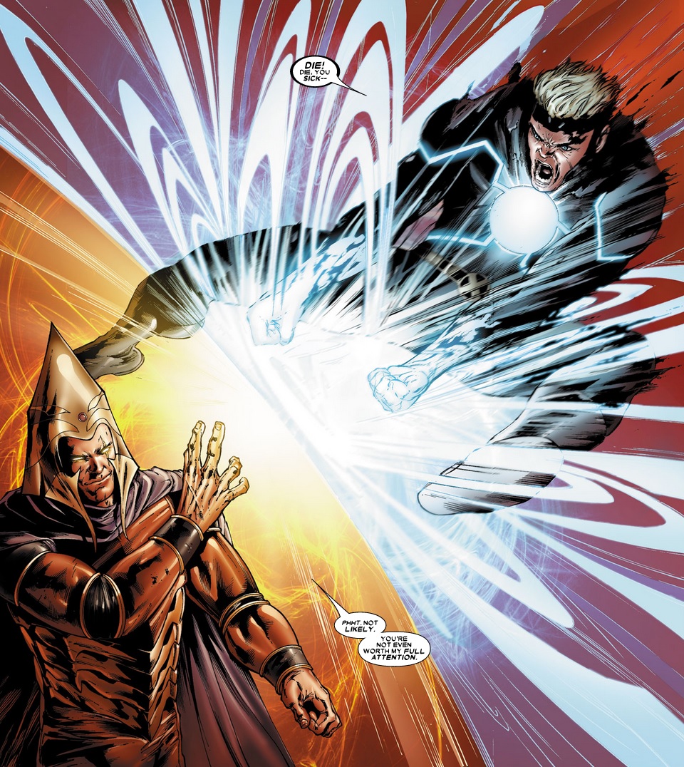 Just when D’ken has the upper hand, Vulcan surprises no one and murders him (brutally, slowly cooking and melting his flesh). Corsair attempts to intervene when Vulcan is poised to do the same to Lilandra, and Vulcan murders him as well, causing Havok to go ape shit and the action starts getting even crazier as half the X-Men mount a rescue of Professor X and the rest take on Vulcan.