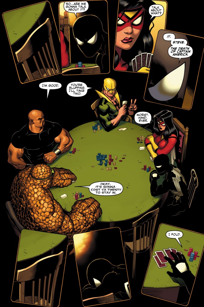 “Denial” stars Wolverine (perfect!) who just can’t believe Cap is really dead. With the help of Dr. Strange’s magic, he and Daredevil infiltrate the SHIELD helicarrier, interrogating Crossbones and finally seeing Cap’s body for themselves. The reeling New Avengers and newly formed, government-sanctioned Mighty Avengers crossover in the interesting “Anger” issue. Most of the issue is constructed with the two very different stories going on side-by-side, as each group supposedly works through their emotions. Iron Man’s team fights off Tiger Shark and a bunch of sea monsters, while the New Avengers tackle a less action-packed but far more intriguing poker game that nearly comes to blows between the arguing heroes.