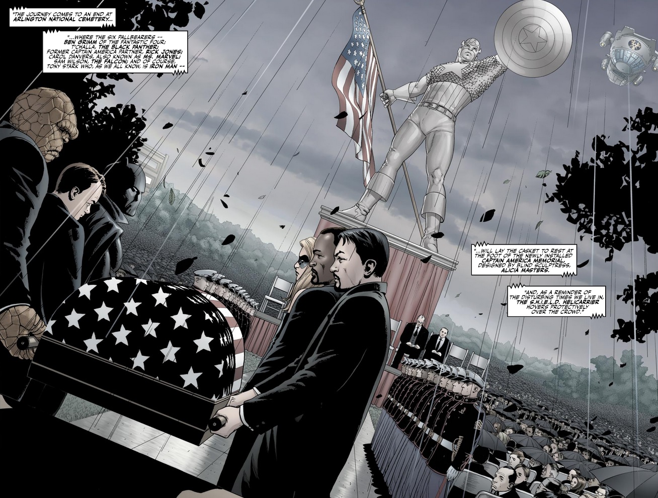 The final issue pays off in the form of Captain America’s funeral, an impressive set-piece in Washington D.C. filled with most of the winning side of the war. Falcon, Cap’s longtime partner, gives a stirring speech that lasts nearly the length of the issue, cutting away nicely to various famous scenes of Captain America, both old and new. Tony Stark meanwhile continues to look like a complete and utter asshole, event when he’s supposed to be remorseful and guilt-stricken.