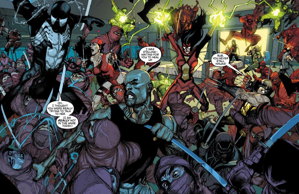 The full story of “Revolution” begins in #27, though it almost feels like a one-off as well. The previous mysterious ninja known as Ronin, Maya Lopez, was given the mission to stay in Japan and monitor the Hand while everyone else was fighting the Civil War. She gets herself captured and tortured by current Hand-leader Elektra, and it’s up to the rest of the team to save her. Eventually.