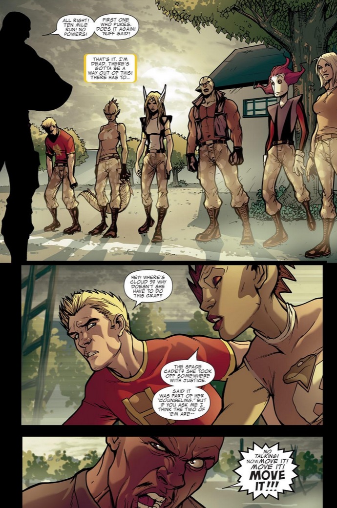 In the very first issue MVP is killed by Armory, a woman with an alien gun that washes out of the program. Trauma is able to shapechange into your deepest fears (making him a Boggart from Harry Potter). When he turns into a giant spider she freaks out and starts firing everywhere, and MVP saves Cloud 9 but takes a shot in the head. His death and subsequent cloning go from mysterious side plot to action-packed main plot in the second volume.