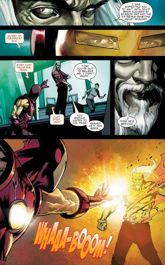 Stark’s investigations are stymied by his own Superhero Initiative. As he’s been displaying erratic and questionable behavior, including leaving his suit on for days at a time, psychologist and perennial guest-star Doc Samson is called in to treat him. Stark is forced to wear a power-inhibiting ankle bracelet and about to be put under house arrest until he proves to Samson that there is in fact a major cover-up going on. Dr. Maya Henson, the woman from the “Extremis” story line that created the virus (and later administered it to Stark), had faked her suicide and gone to work for a pharmaceutical company to continue Extremis’ research and development.