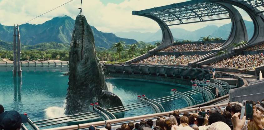 Once Indominus Rex (god I hate that name, at least Chris Pratt, as the Voice of the Audience, calls out how dumb it is when he first hears it) accidentally breaches the aviary, all the pteranadons and dimorphodons immediately fly out. The weird bit is, they act like a horde of mindless, people-killing monsters as they go toward the park and attack everything in sight, often disregarding their own safety. For a film that’s generally done a solid job propping up the dinosaurs as actual animals and real creatures (part of Owen’s cornerstone for being a Raptor trainer and Claire’s growth as a person) it’s a really weird, jarring scene. Also includes a rather unnecessary and oddly exploitative death in Claire’s rather useless assistant, as she’s battled over by various fliers before being devoured by the film’s Chekov’s Gun – the truly monstrous mosasaurus.