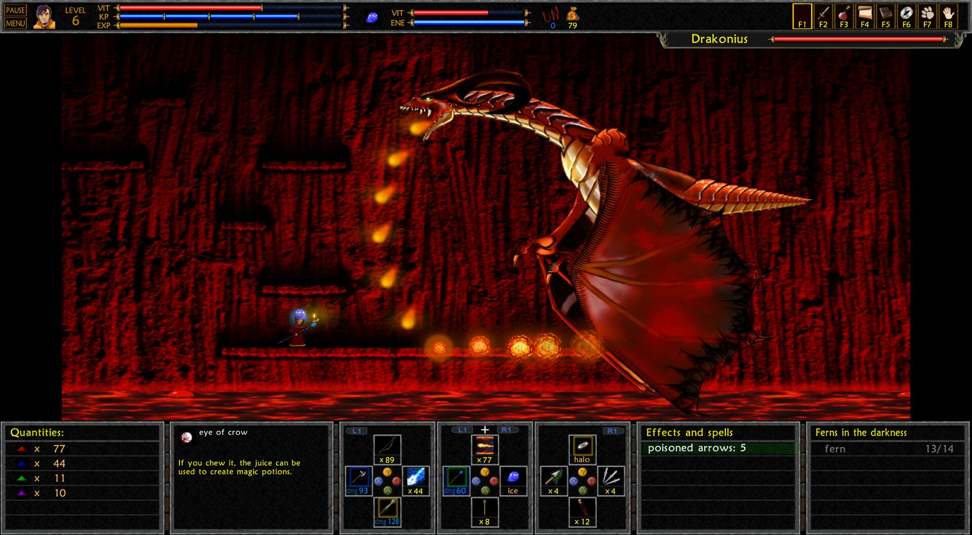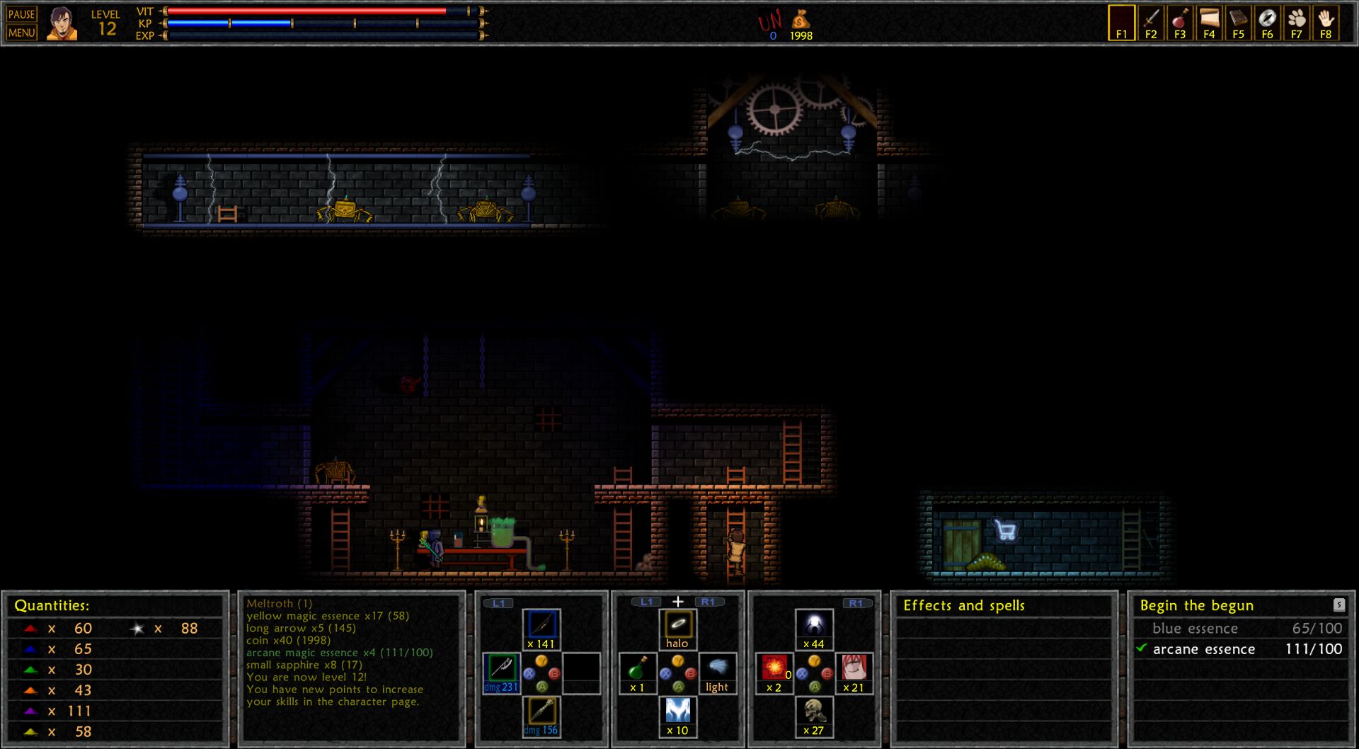 While the story isn’t exactly as captivating as even the relatively simplistic tales in Castlevania or Metroid (or even Diablo), the gameplay makes up for it. The dungeon is made up of individual rooms that take up a full screen. Each room is darkened and made up of multiple levels filled with ladders, platformes, and enemies. Lighting the torches along your way becomes critical, and a neat way to gauge your progress through each zone.