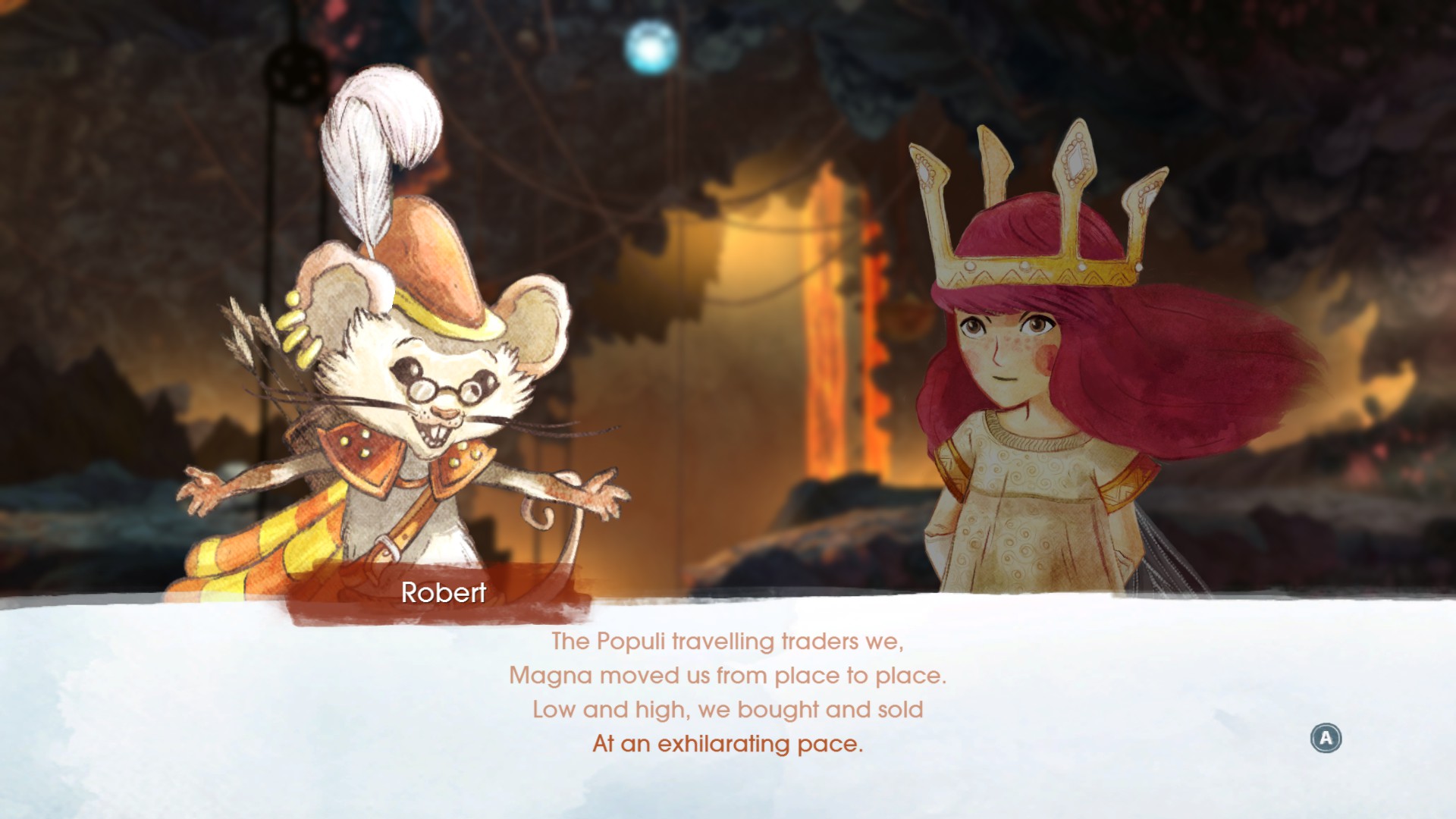 It doesn’t get much more fairy tale than that. The magical world and its inhabits reminded me of The Wizard of Oz. Aurora meets up with colorful characters from various factions, like the gnome-ish spellcaster Finn of the Capilli and the business-savvy Robert the archer of the capitalistic mouse-people Populi. Their distinct personalities and combat specializations shine through, and the way they all rhyme with each other is impressive, thought a bit tiresome.