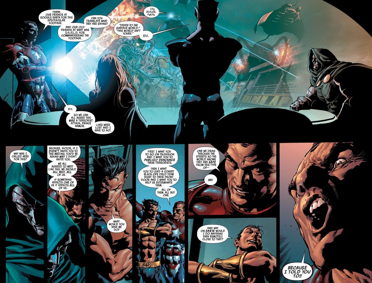 Osborn soon has need for his ultimate weapon when a random Atlantean terrorist cell attacks. Namor is brought in as a brief but delicious cameo as someone that doesn’t take any of Osborn’s shit. Instead of seguing into another action-packed battle with the team, they send Sentry to basically kill them all.