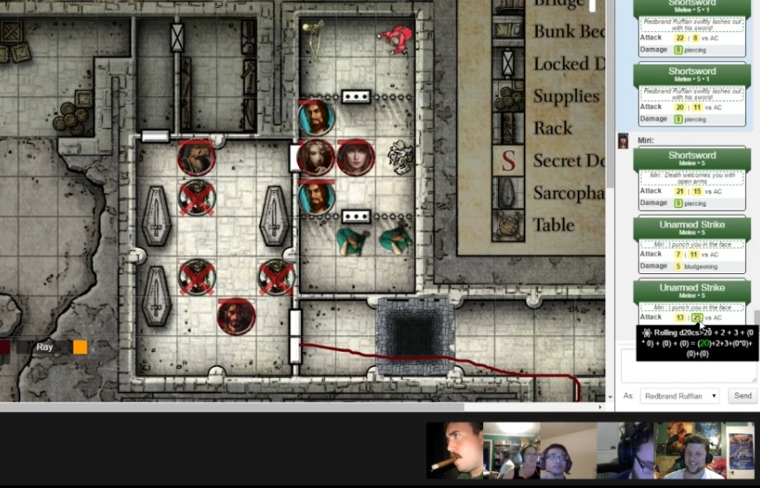 Afterward they attached the rope to various doors once the more Dex-focused rogue Kethra crossed the threshold, creating a rather brilliant handrail. Players were using Inspiration left and right to avoid falling, and while I was a bit more cavalier with rewarding it, I also felt like everyone is nicely settling into their roles and role-playing a bit more, much to my liking.