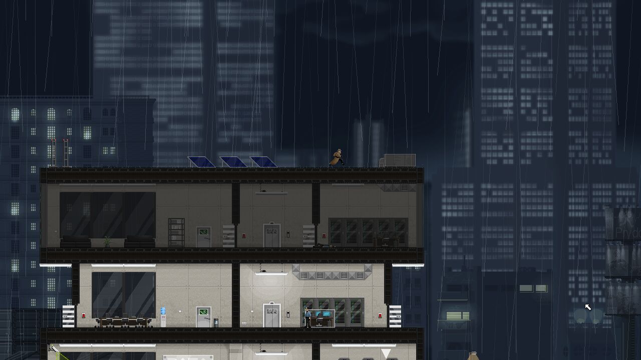 Gunpoint stars Richard Conway, a private investigator that lives in a pixelated world full of guards, security cameras, and breakable windows. During the opening sequence Conway witnesses the murder of a potential new client while trying out his new Bullfrog brand Hypertrousers. The pants allow you to charge up super jumps, breaking through windows and falling from any height. This allows you to concentrate on the puzzles in each level rather than any tedious platforming.