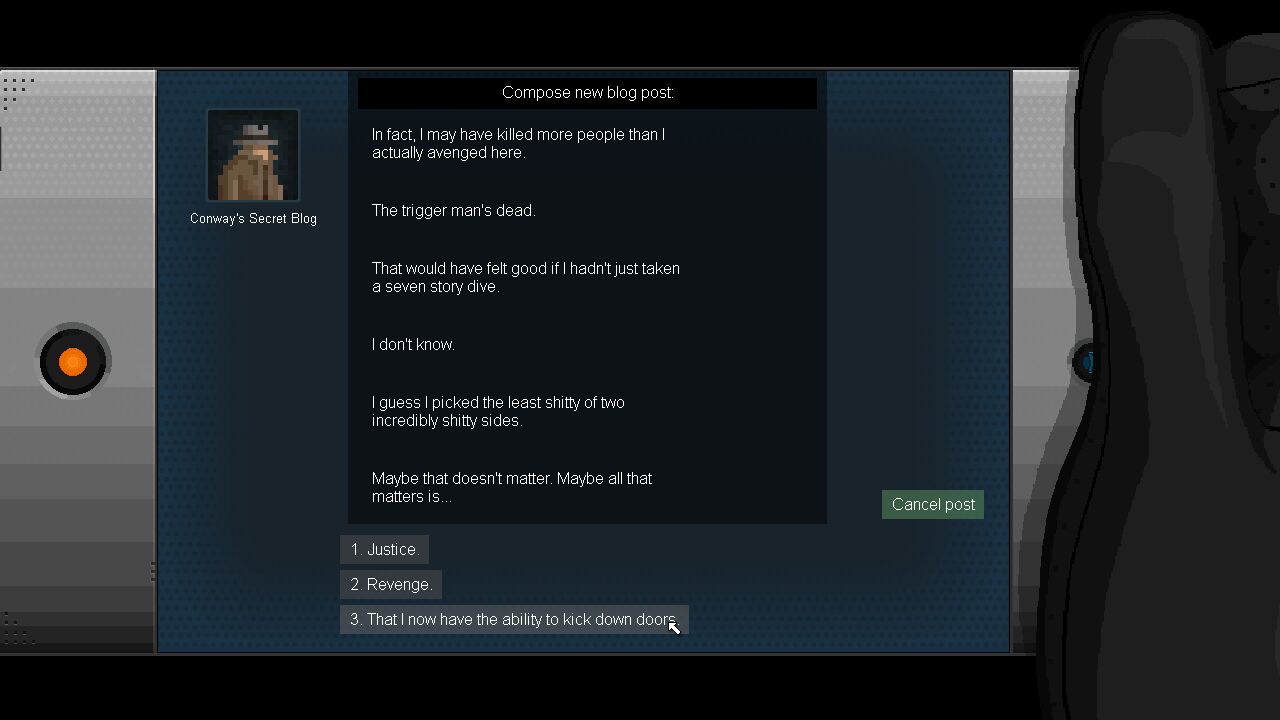 Conway is suspect #1 in the murder investigation, and the story follows a funny tale as he’s hired to first erase the data by one party, then try and recover it by another. The story unfolds through a simple text-based dialogue between a pair of pixelated faces. It’s a rudimentary as you can get. Thankfully the writing is particularly amazing. I laughed out loud throughout the unfolding noir drama that maintains its self-aware snarkiness.