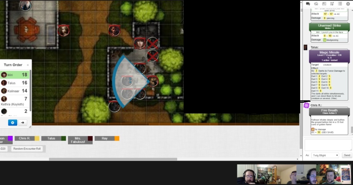 Twig Blights have very little HP and a weak attack, but they often come in large groups, affording me lots of attack rolls. This was a group of eight, which quickly turned into none because I rolled a freaking one for Initiative (two with their Dex bonus). Argh! After their initial surprise round, in which one barely scratched Kalinaar, the PCs quickly took care of business. Miri charged in to stab and punch, Talus unleashed a volley of Magic Missiles, and Kalinaar breathed fire all over the vulnerable plant creatures. Even Kethra got in as they tried to retreat to the South.
