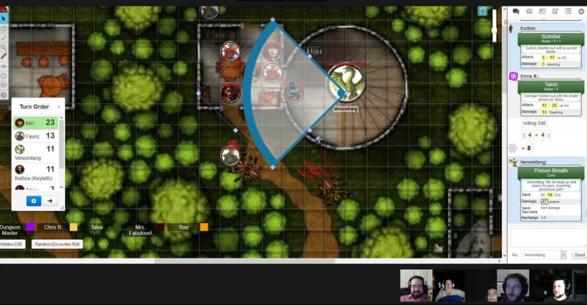 Kalinaar the paladin had his own speech alongside Favric, the cultist leader. The cultists had acted friendly and waved the PCs into the dragon’s tower, only to offer them as further reward to the dragon in exchange for his allegiance. I had both Favric and Kalinaar roll Persuasion checks, and Favric won. The cultists fled the building and the dragon attacked the PCs, starting with his devastating acid breath.