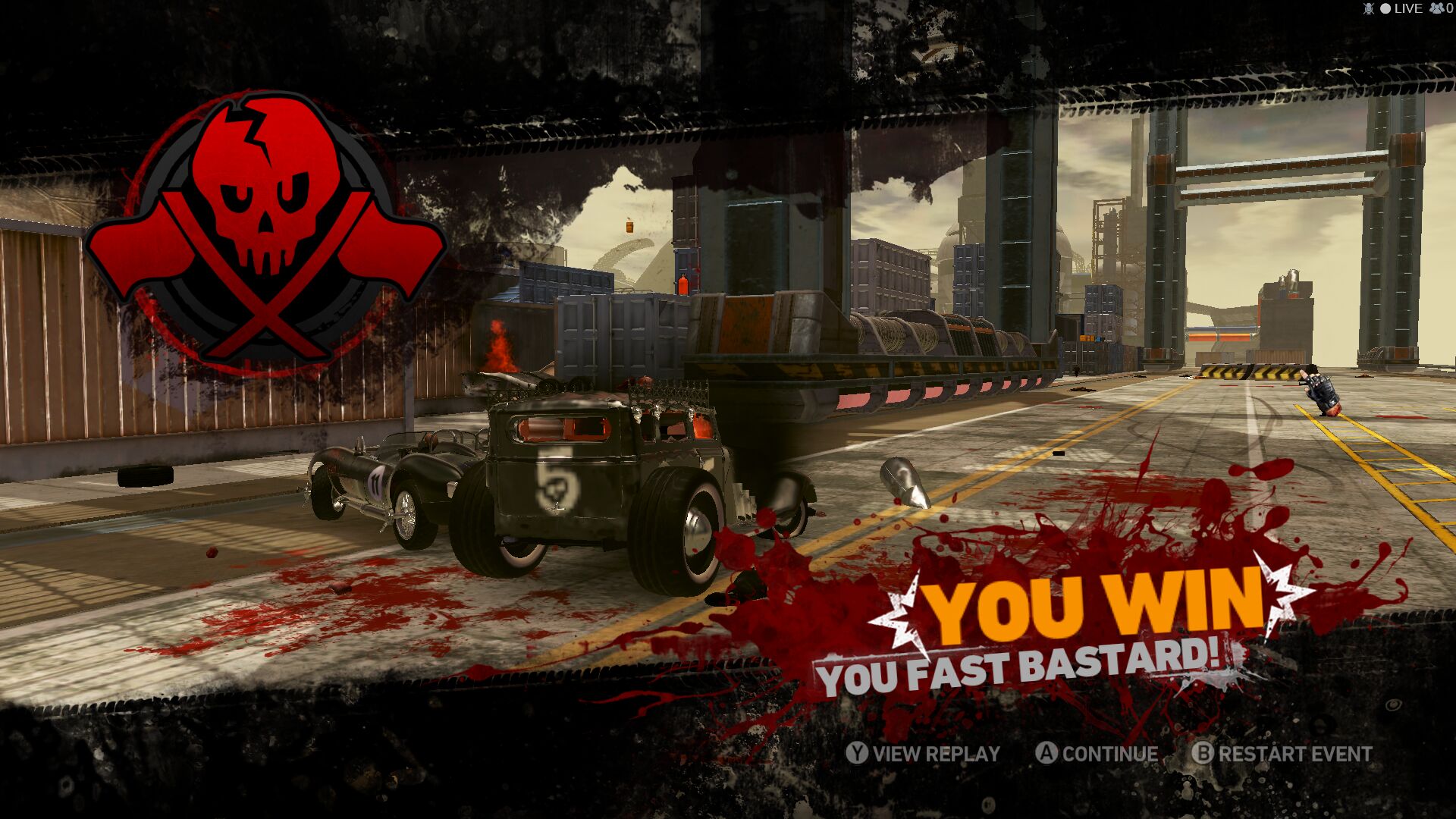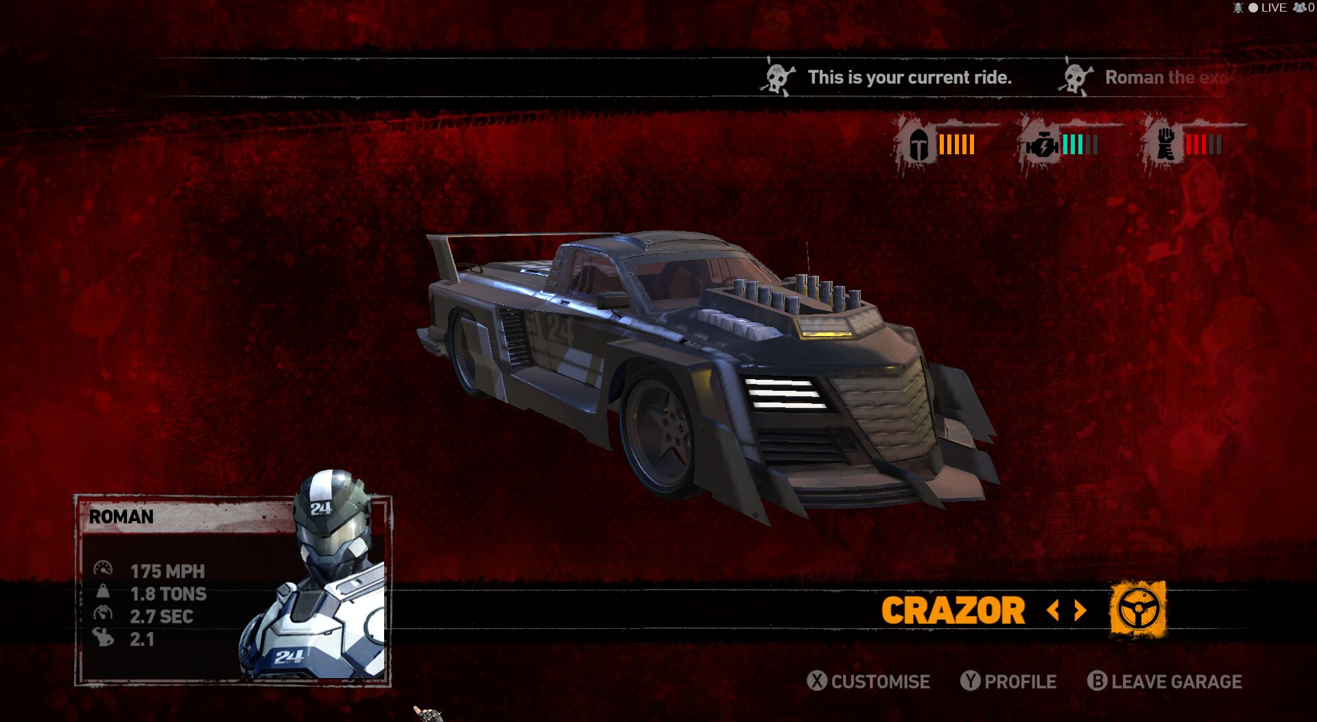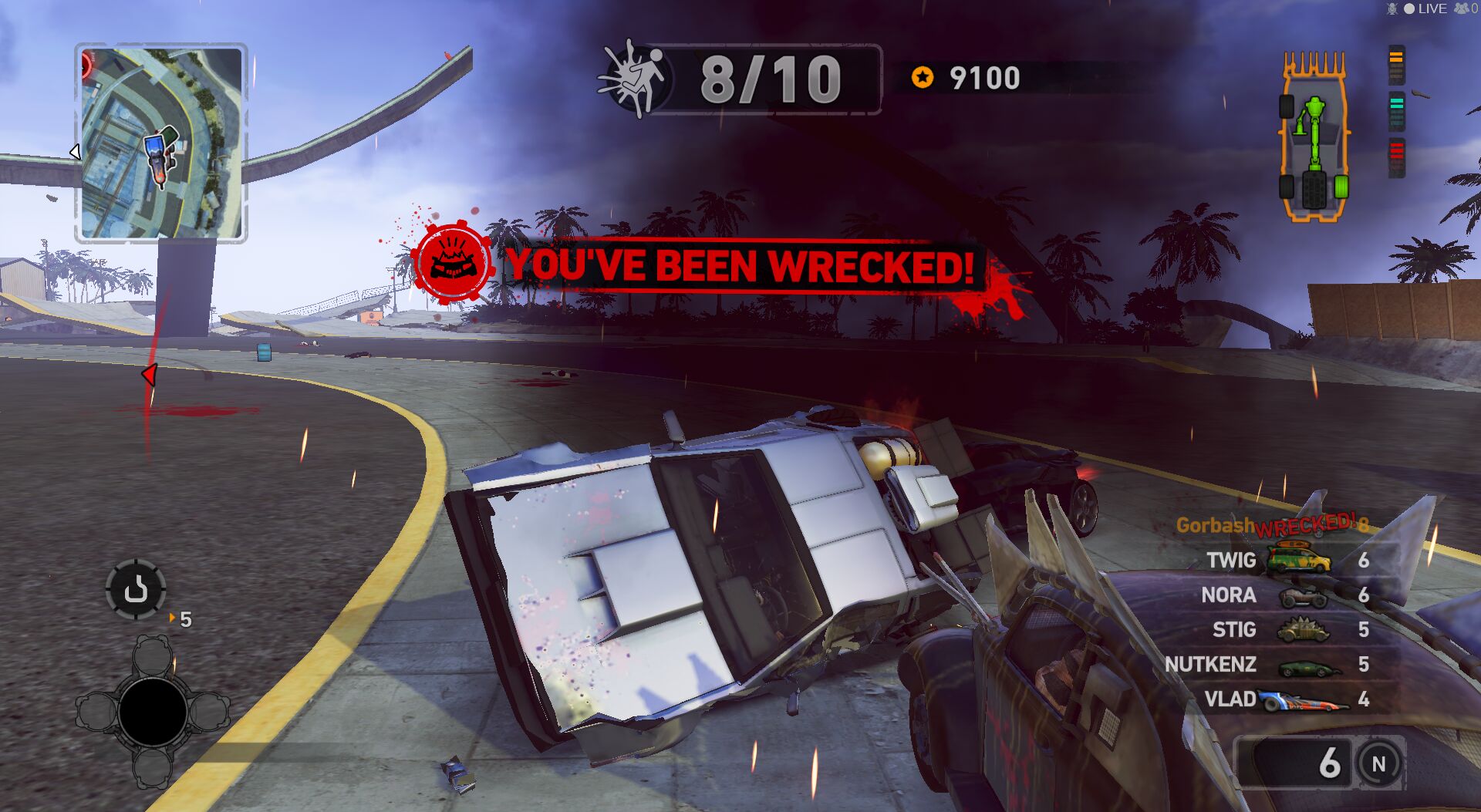Your own destruction comes swiftly and often. Recovery and repairs cost credits, which are earned by doing good things like hitting other cars and people. The ratio of getting destroyed is completely out of whack, however. Early and mid-game especially I was constantly getting destroyed, even when upgrading my armor and driving supposedly tougher-ranked vehicles.