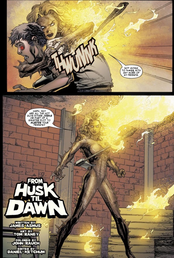 My favorite part of the event is that it actually gives long-absent ex-X-Men Jubileee something to do. As one of the depowered mutants from the aftermath of House of M she hasn’t really been seen for years. Here she’s chilling in San Fran with friend Pixie when a vampire suicide bomber explodes next to her, infecting her with a bioengineered version of vampirism (okay technically just the desire to be fed on by a vampire). Xarus’ plan is to turn the X-Men one by one, and she’s the guinea pig.