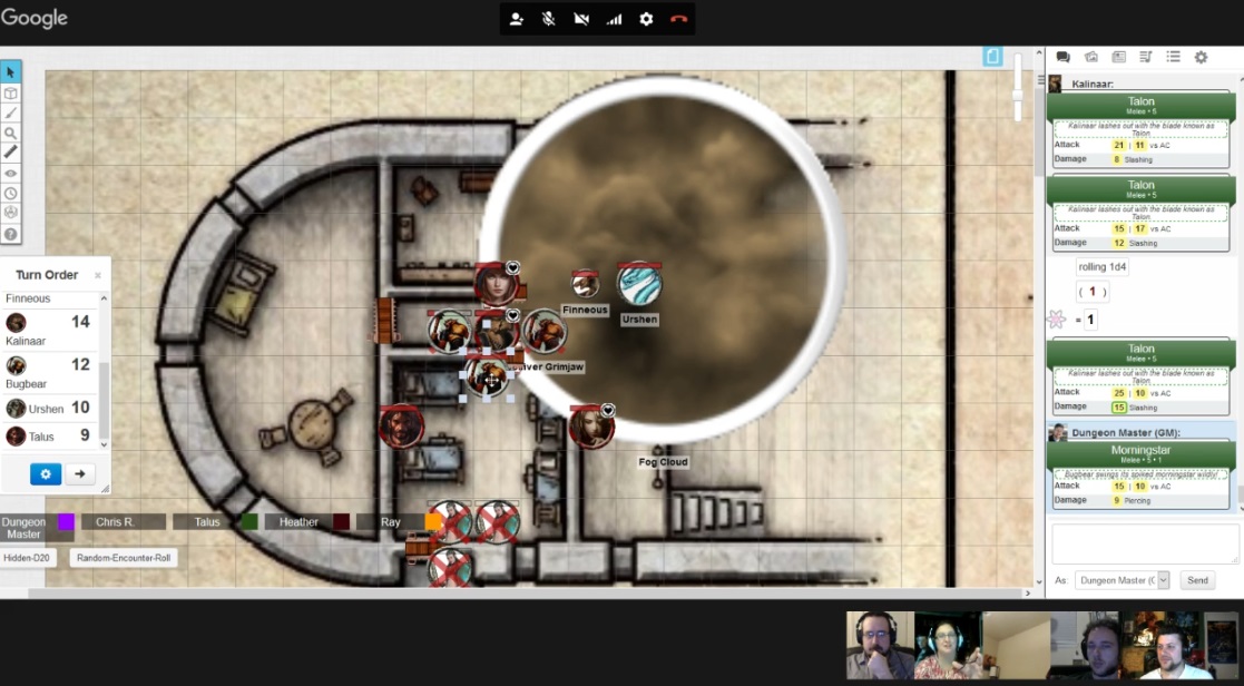 It didn’t really work here. The bugbears also walked into the corpse-filled hallway. They got some powerful strikes off, and a Fog Cloud moved everyone into the smaller room. The fathomer cast a frost shield on himself which freaked everyone out.
