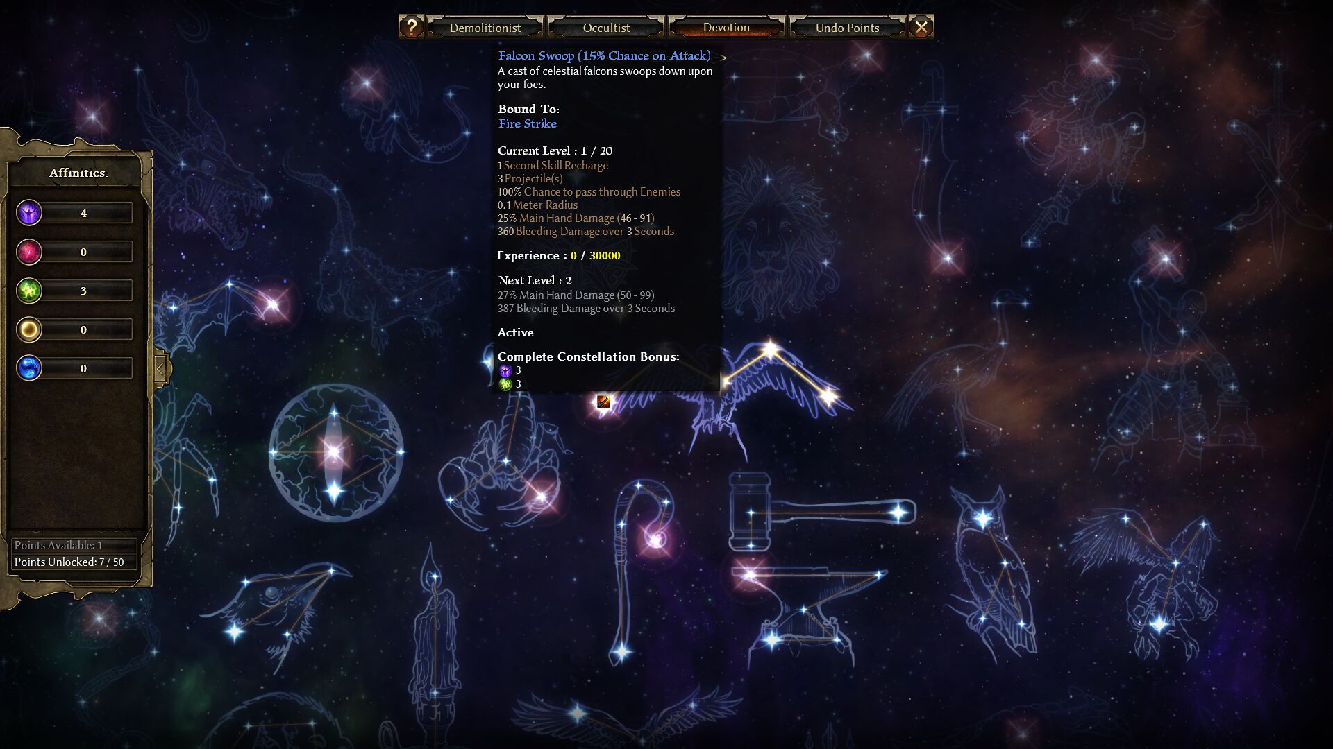 Doing so rewarded you a point that you could spend among these stars, almost all of which lead to further passive buffs. However, most constellations gave a unique skill if you completely filled them out. They were also divided into six different types, with stronger constellations requiring a certain amount and type of previous Devotions. It added an additional layer of complexity to character building that I warmed up to, and soon had a cool path laid out.