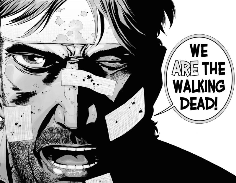 Rick is right not to trust Martinez. He splits when he gets the chance, and Rick hunts him down and kills him before he can tell the others where they are. That’s the show-Rick we know and love! Honestly other than that comic-Rick is way more of a pansy. He’s constantly whining, self-doubting, and generally unlikable through most situations. Hell he spends most of the climax of Volume 8 simply running away.