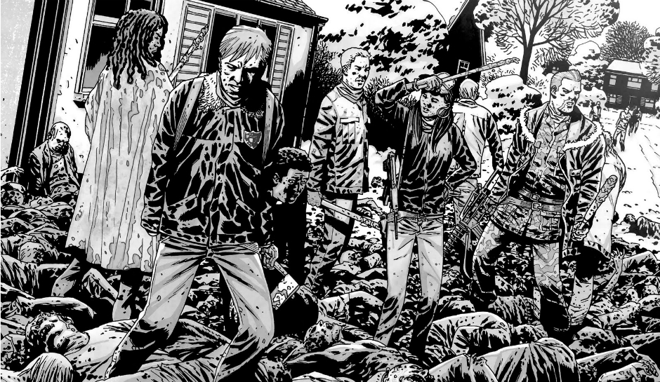 The comic gang comes in contact with lots of bad people, but mostly it’s about them trying to adjust to life in Alexandria. They learn how to be normal while at the same point dealing with conflict and ultimately knowing their strength lies in their combat prowess – Andrea, Rick, Abraham, Glenn, Michonne are all incredibly useful people to have when surrounded by zombies.