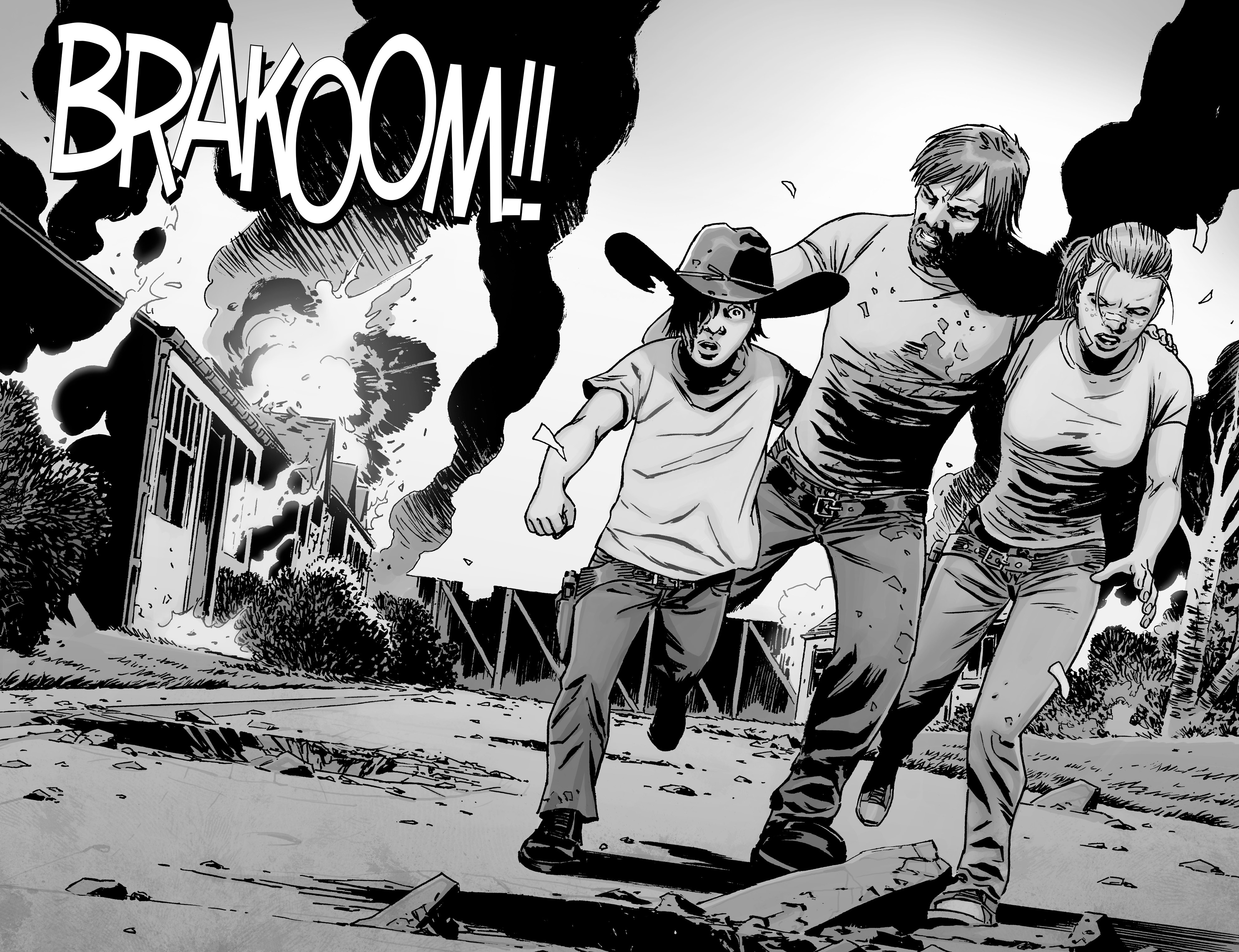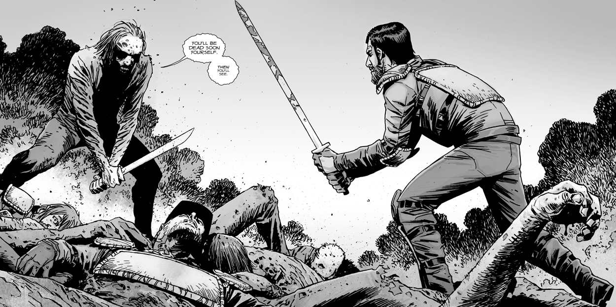 It’s another insanely action-packed war-zone. Negan’s forces eventually pull back, leaving Rick and company to lick their wounds. Eugene is captured while out making bullets, but with Dwight’s help (and Negan’s doctor) they mount an escape. It’s a lot more exciting and involved than Jesus’ lame rescue of Daryl in the show. Though to be fair, Eugene’s capture just happened in the mid-season finale.