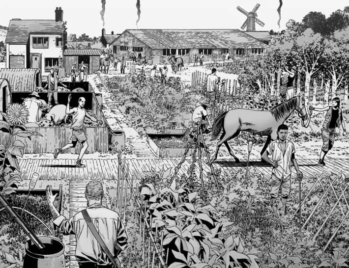 The war ends. The three communities plus the Saviors join forces to work together. This is the point at which I think The Walking Dead show should end, because the next Volume “A New Beginning,” starts with a big two-year time jump.