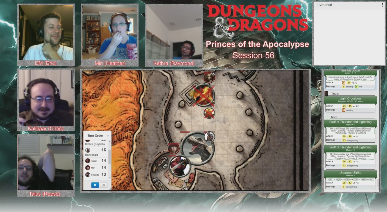 It was a useful round, as they were able to take out one of the priests before he was ever the wiser. However as the first of them charged in they saw another occupant – an Efreeti lounging in his room to the South (W9). The powerful fire genie joined the fray, summoning a Fire Elemental. Talus responded by Polymorphing Kalinaar into a T-Rex, Miri unleashed her Lighting Strike and Thunderclap attacks, and another epic battle was on!