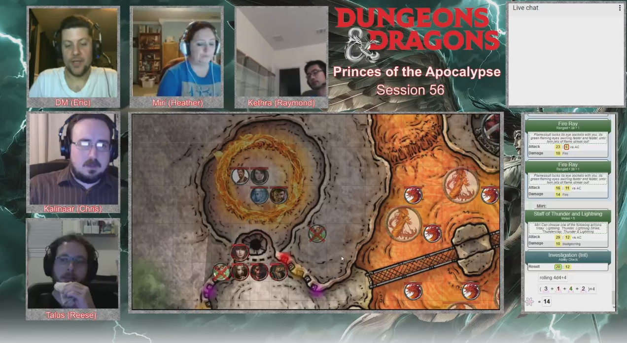 There was a lot of deliberation and strategizing on how to get them out. The easiest way is to simply cast Dispel Magic, one of the most basic Wizard spells. But apparently Talus doesn’t have it (and to be fair, has never really needed it before). They couldn’t fly in and grab them as the fire stretched to the ceiling. Kethra wanted to go down and scope it out, but I warned it looked very hot and uh, damage-y down there.