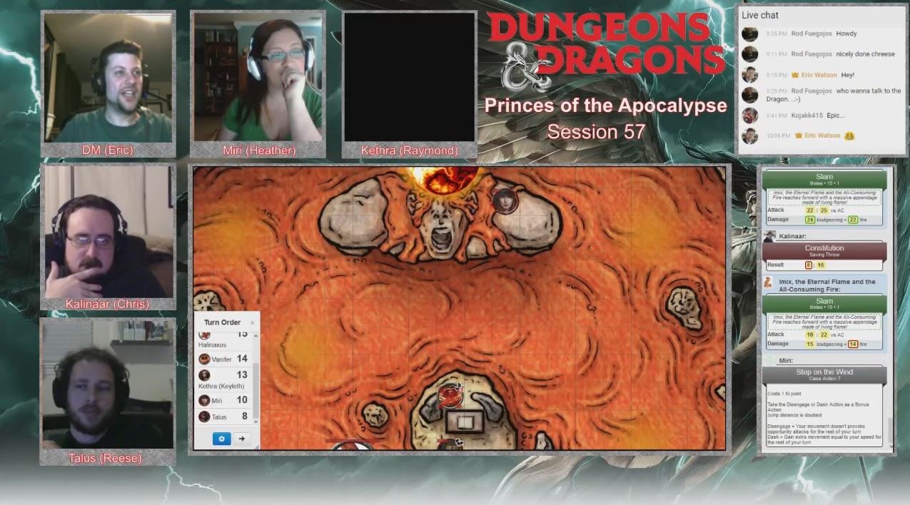 Eventually Imix turned his attention back to them (after Talus went down and Kethra hovering near death) but it was too late, Vanifer lay dead and Kalinaar tossed her elemental dagger Tinderstrike to Miri. Her monk-ness let her leap across the lava and scurry up the colossus to toss the dagger into the portal in a very cool and climactic action-packed moment.