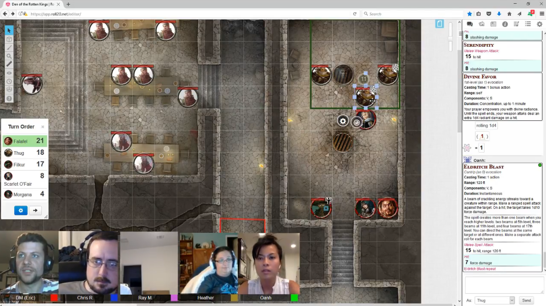 The Entangle spell got three of the thugs, but the third one ran over to Filkur and bashed him good, ending his concentration. The thugs proved tricky foes when they could use their Pack Tactics. The other two surrounded Scarlet and I rolled 20+ on several hits in a row, downing the Southern Belle paladin.