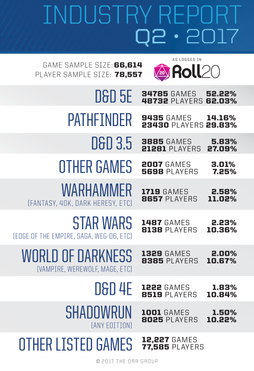 Tabletop gaming website Roll20.net released their quarterly report for Q2 2017. They break down some interesting stats on who’s playing what on the website.