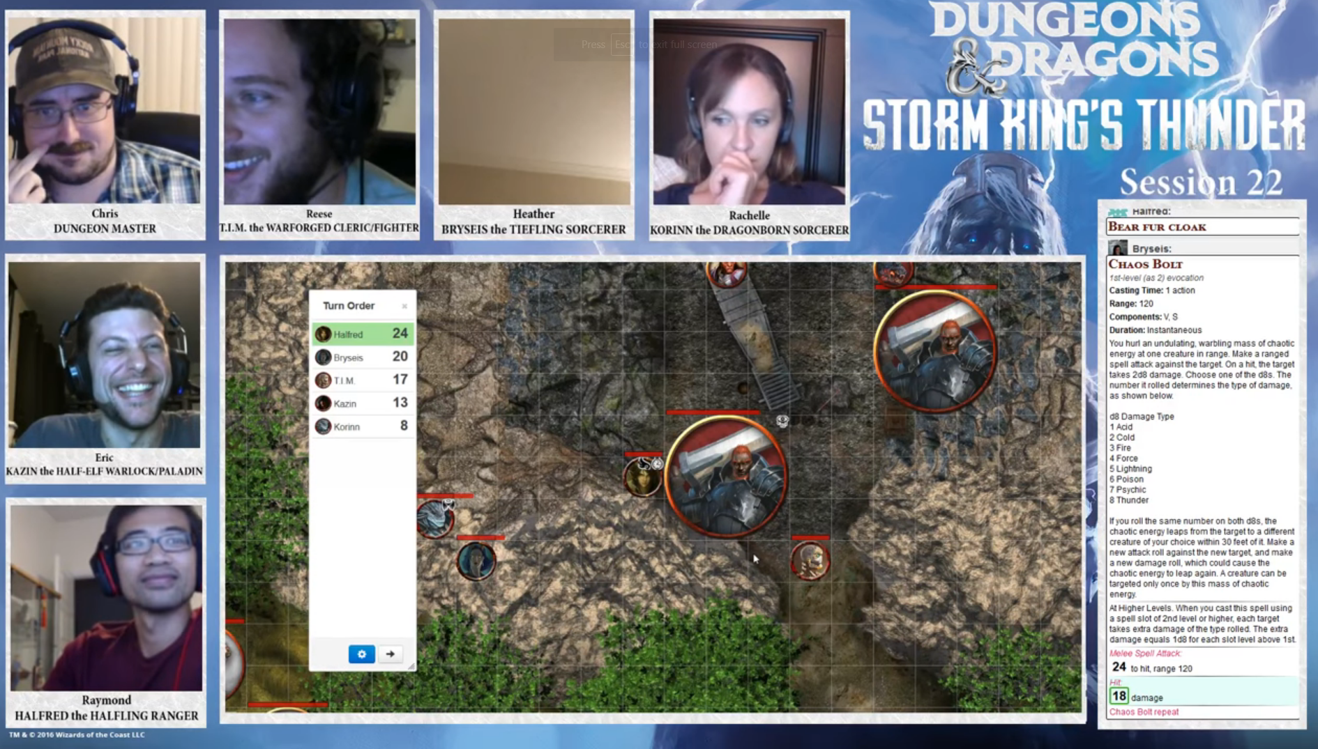 The DM let Halfred approximate a targeted shot to one of the Fire Giants’ eyes. His roll resulted in half-blinding the brute, granting him disadvantage. Korinn Twinned a Haste spell on Halfred and Kazin. Bryseis began raining down Chaos Bolts (Fireballs wouldn’t do much against Fire Giants), and T.I.M. and Kazin strode up to the Giants for some brave tanking duties.