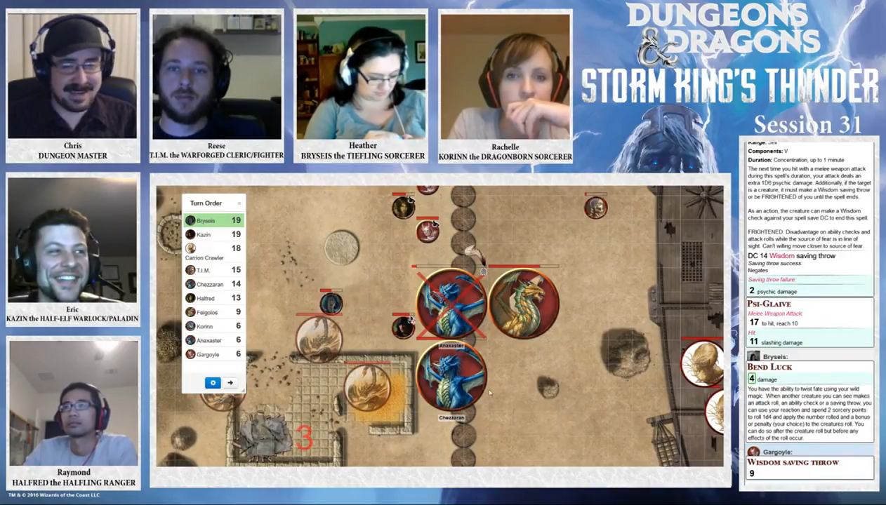 Holy hell! What a fight. Amazingly no one actually went down, though we all took heavy damage (about 50% HP, with more like 90% for T.I.M.). We defeated four carrion crawlers (CR 2), four gargoyles (CR 2), and two young blue dragons (CR 9). I initially believed they were both adults (CR 16), which prompted the Don’t Fight plan, but while very challenging they were actually doable as young dragons.