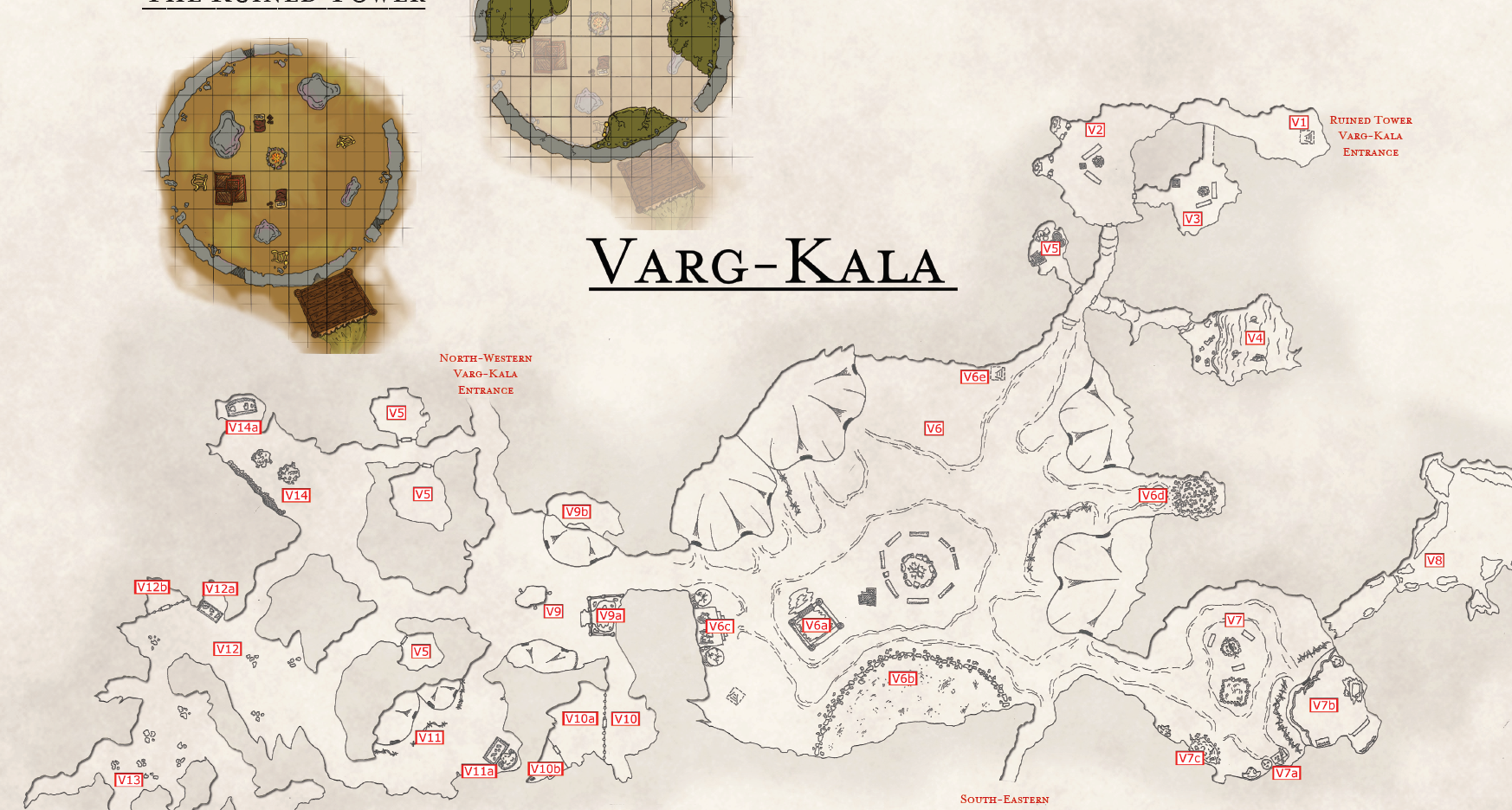 Varg-Kala is awesome. It’s a sprawling network of connected caves, with a central chamber that’s over 200 feet across, and an underground (er, more underground) sewer system – 14 total areas. There are three optional side entrances you can employ if your characters carefully search (or if you just want them to enter a certain way) as well as a proper main entrance guarded by a ruined tower.