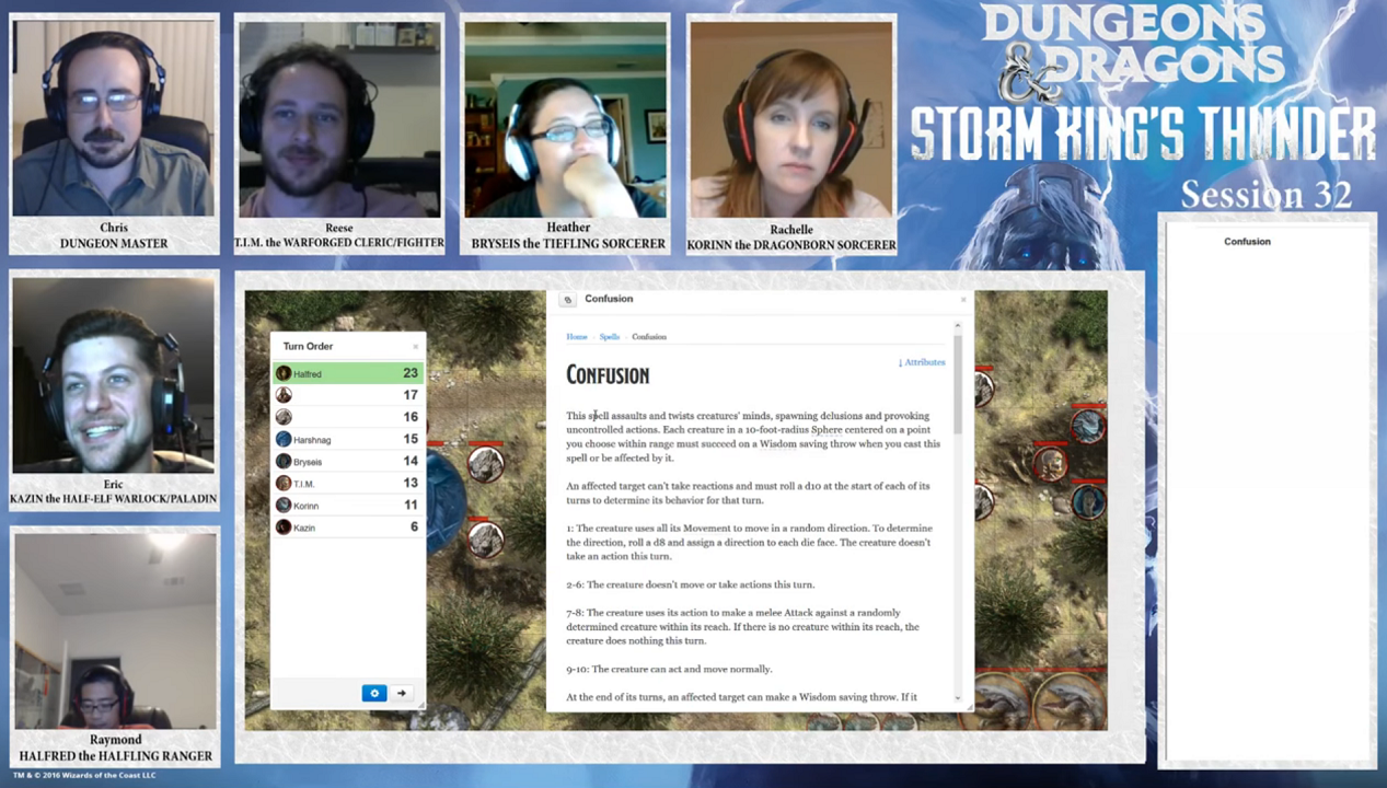 Bryseis cast a nasty, jumping Chaos Bolt. With Tides of Chaos and crazy high damage she was forced to roll on her Wild Magic Surge table, and recieved her fourth bad wild magic roll in a row – Confusion centered on herself. T.I.M. made the save but both she and Korinn would be affected by it for several rounds, knocking them out of the early fight.