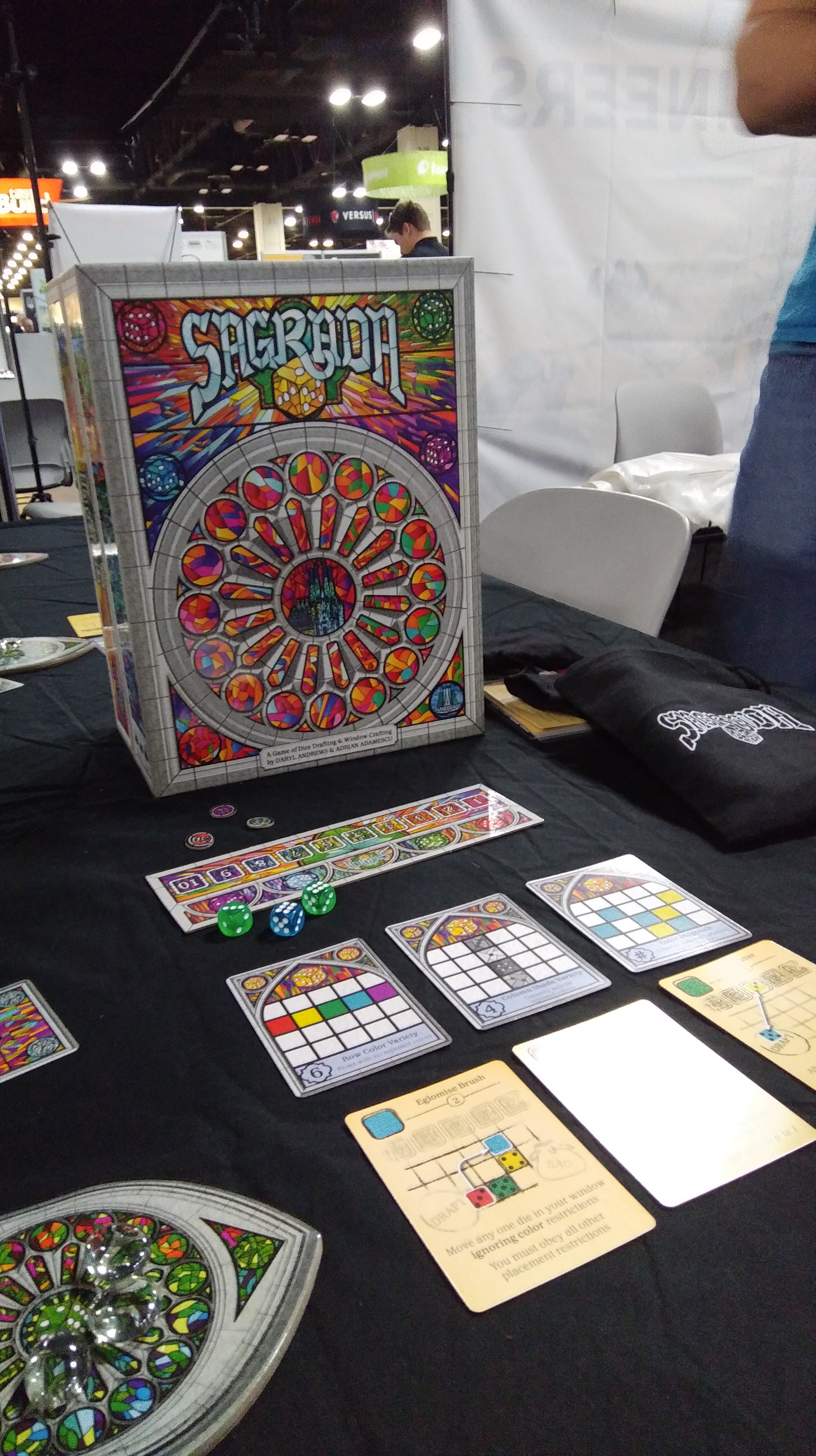 I checked out Sagrada, which happened to be one of the few games that had already released. It was a lovely dice-drafting abstract, where players competed to build the best stained glass window. It was easy to learn and I quickly saw the challenge of working around the color and number window restrictions.