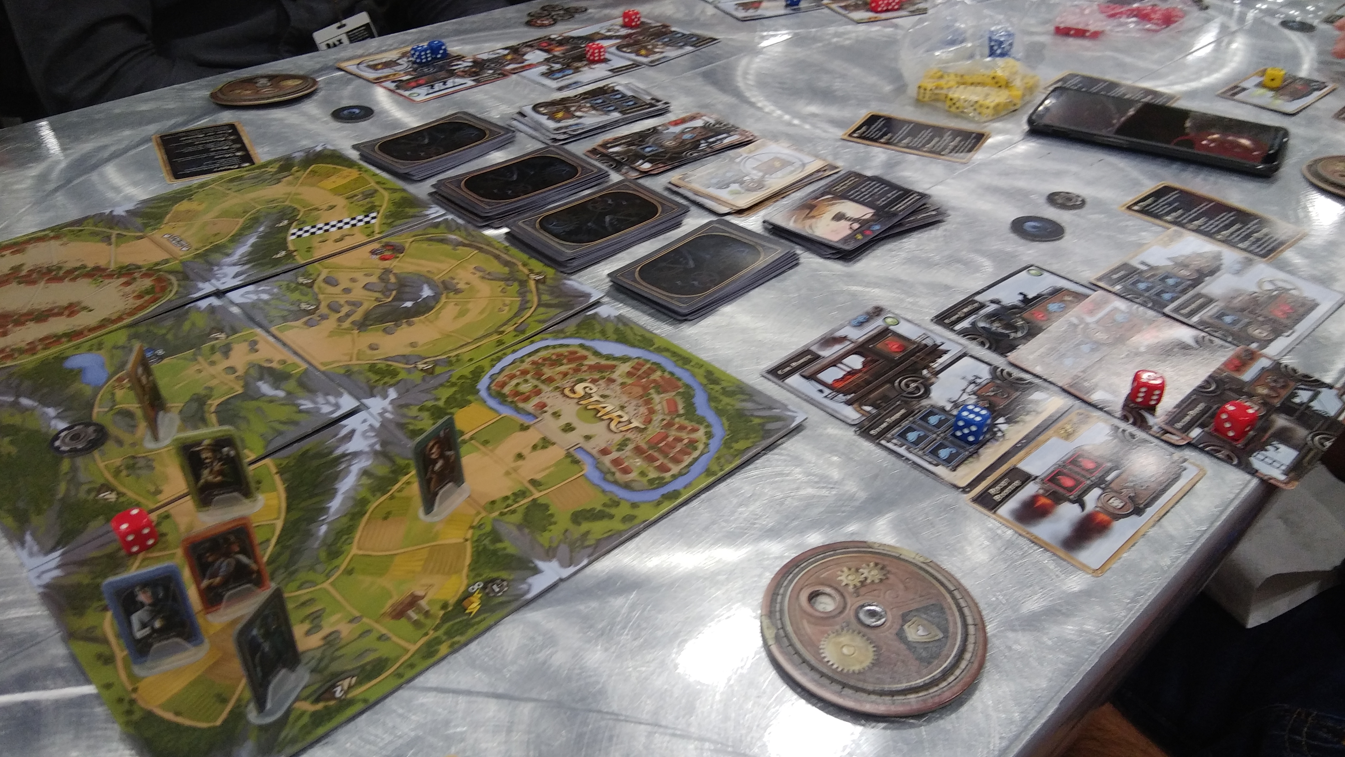 This time I picked out the next game, settling on Steampunk Rally, which I’d learned about on Friday. It has a steep learning curve we had to get over, but it helped when I found a YouTube video from Roxley that explained the game.