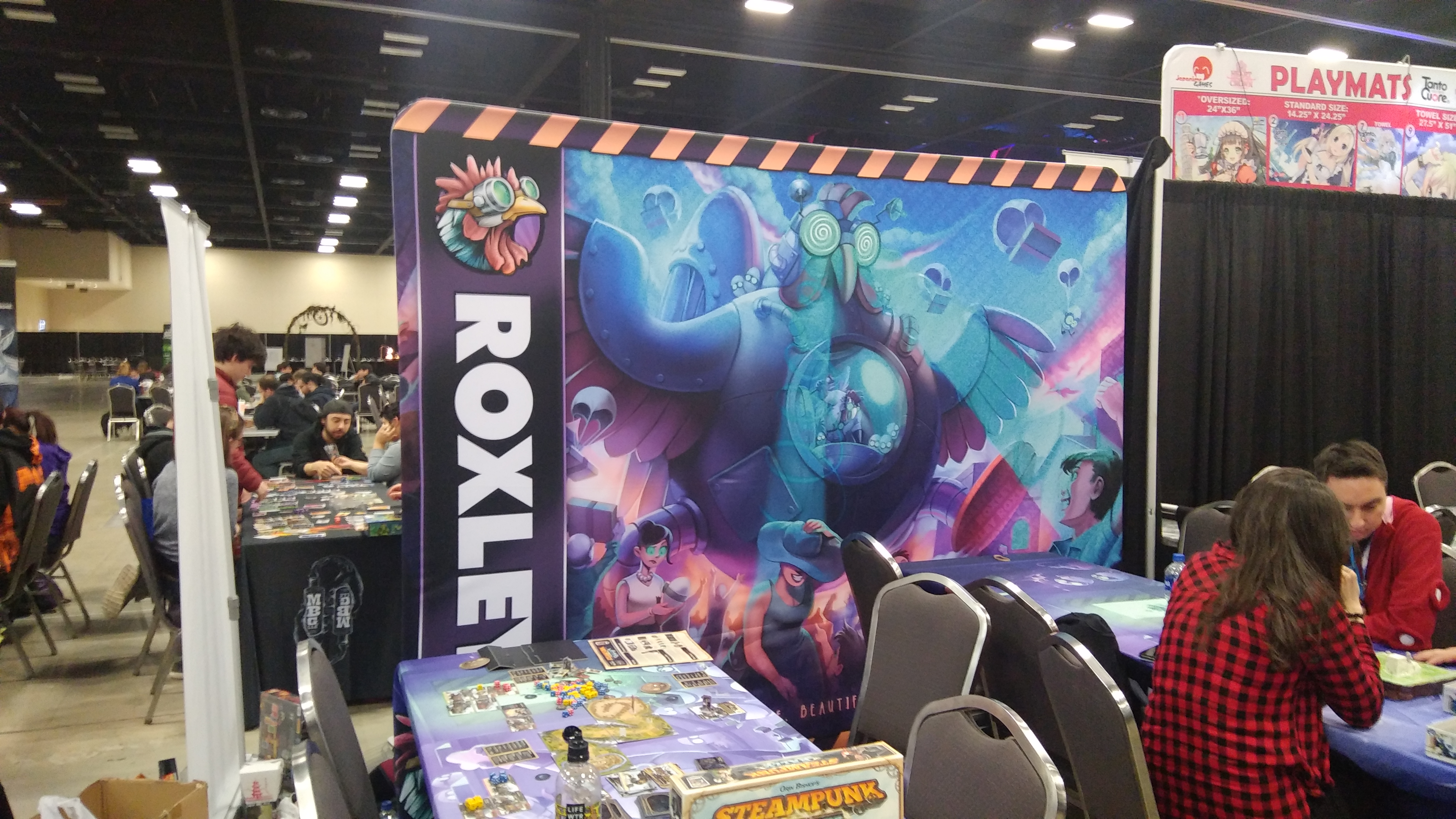 They caught the Patrick Rothfuss panel while I went back to the hotel to check in with the family, change, and meet everyone at the Tabletop Area that evening. I enjoyed talking with Roxely Games and trying Santorini. Always helps to learn from the publishers! I would return to Roxely throughout the weekend to chat with Paul and learn about their whole library: Brass, Steampunk Rally, and Super Motherload.