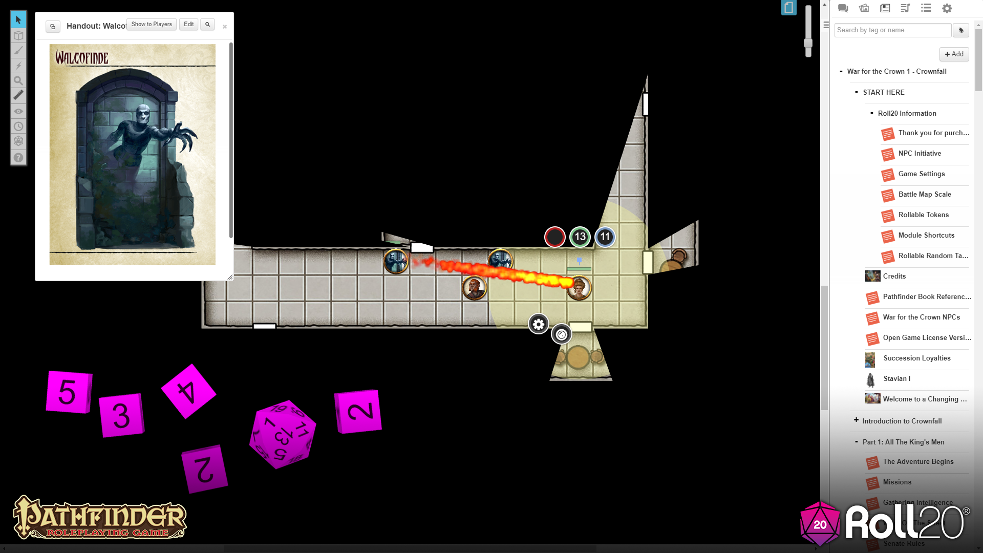 The first official Pathfinder module on Roll20 is Crownfall, written by Thursten Hillman. Crownfall is part 1 of 6 in the War for the Crown Adventure Path. Instead of releasing large, $50 campaign books every six months as Wizard of the Coast does, Paizo releases episodic modules called Adventure Paths, similar to story arcs in a comic book series.
