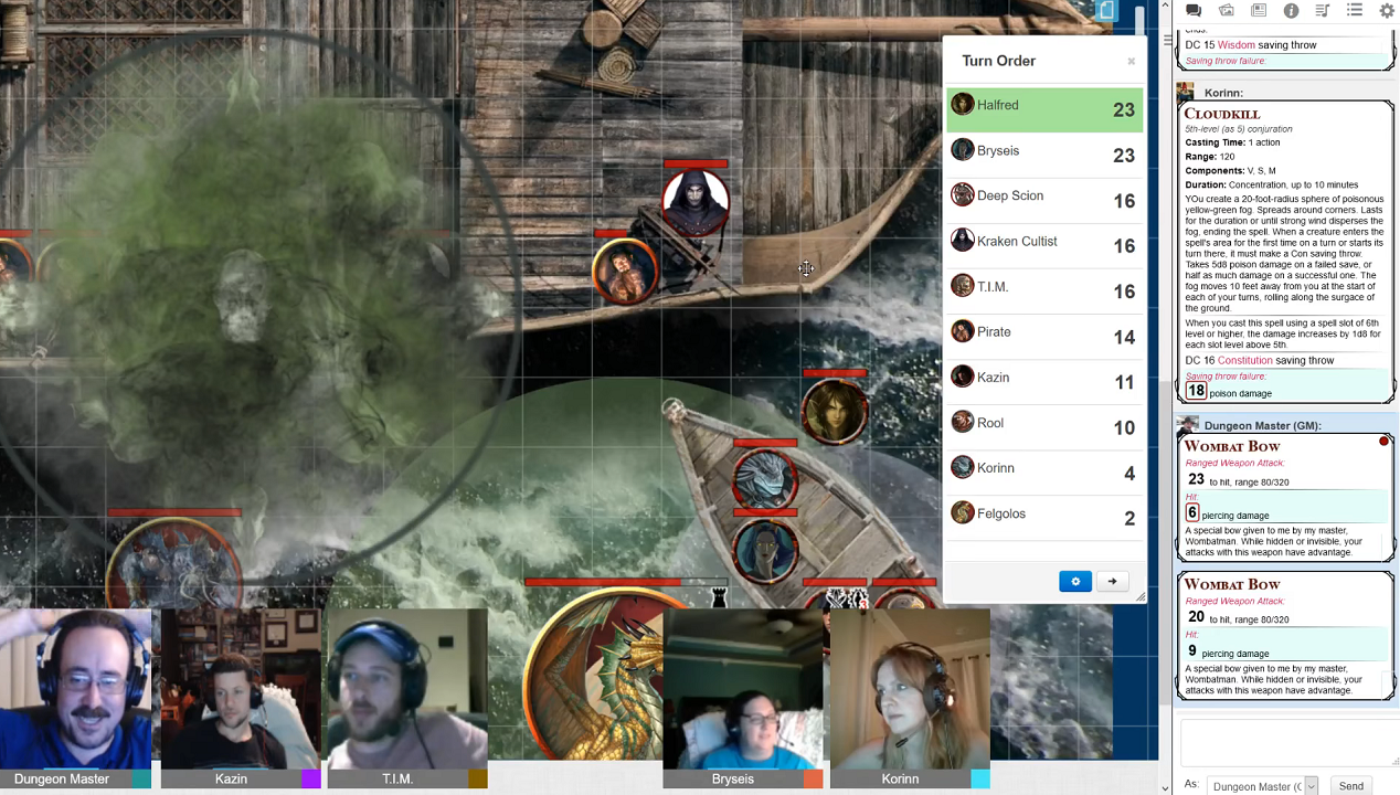 Halfred shot a Smoke Arrow from an impressive distance, blanketing the cannons, and Korinn followed up with a Cloudkill to begin choking the clustered pirates and Kraken Society cultists.