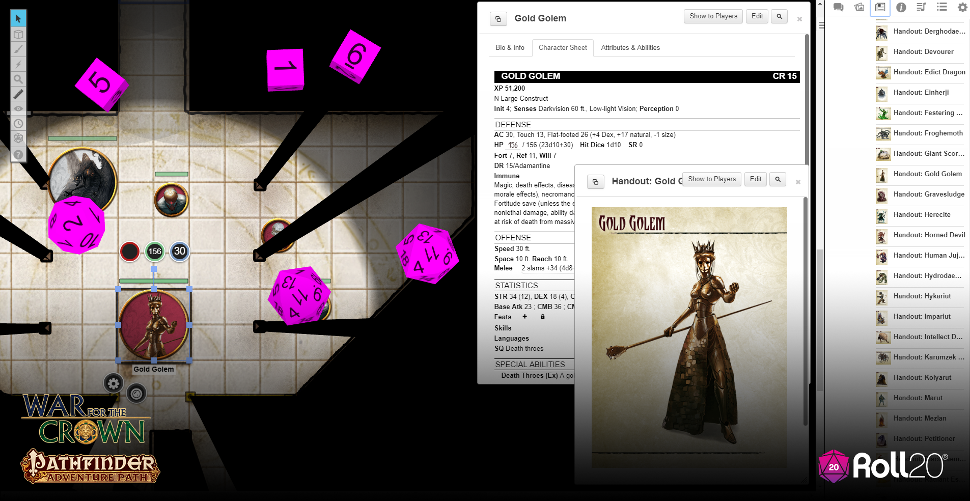 - 54 NPC monster sheets with draggable tokens, vision, and separate player handouts.