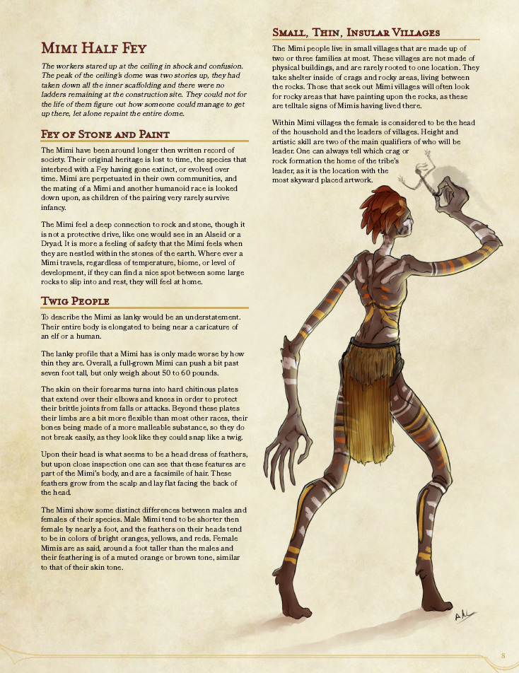 The Adlet half wolf lower bodies and feel adapt in wintery climes, while Kitsune grow tails as they age and gain wisdom, which in D&D terms translates to reflecting their WIS score. Mimi had by far the coolest look and culture, living in small isolated communities, squeezing between rocks with their elongated bodies and painting their caverns.