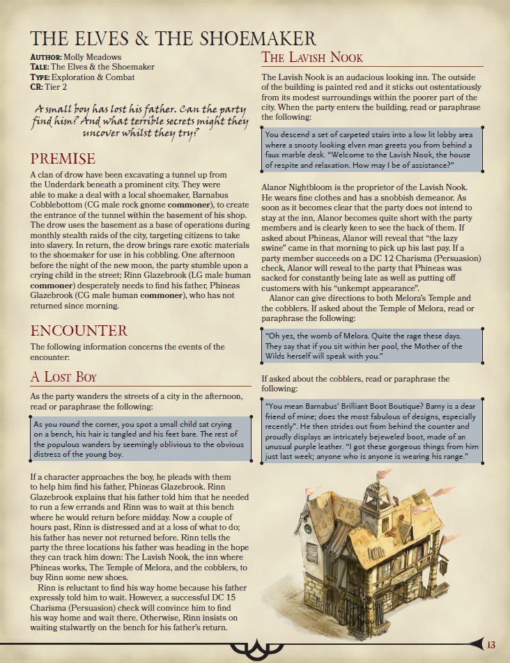 The most effective encounters are those that can be run easily, with fun, obvious ties to classic fairy tale stories. The Elves & the Shoemaker is a sterling example, as the PCs investigate a missing father, which leads them to a cobbler. The cobbler is in league with a Drow raiding party, including an entrance to the Underdark. It’s tied up with a simple combat encounter but it’s a fun twist on the story.