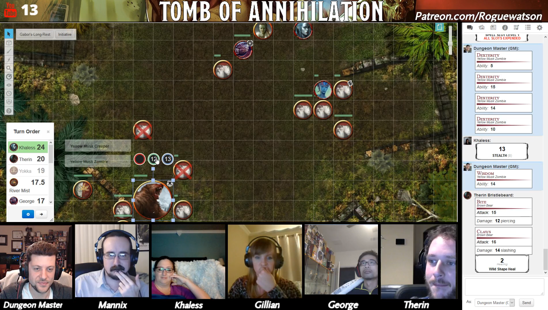 The hard-hitting zombies actually took out Therin’s bear form, rendering him back to dwarfness. A follow-up attack was a crit and we all stared shocked at the screen as I rolled very bad damage on the double crit dice (17 dmg on 6d8), which would have killed Therin outright. Instead he was reduced to one hit point after Undril had just healed him. Oh my.