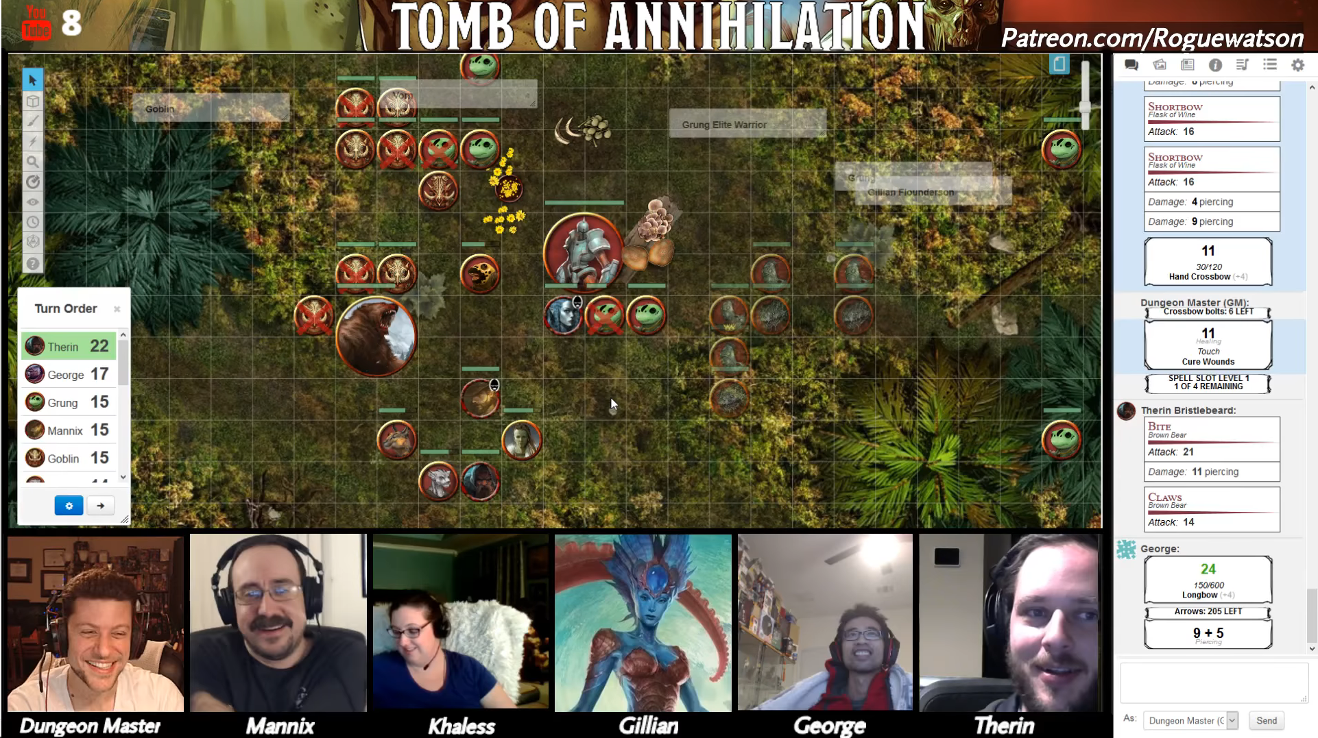 I used a lot of hand-waving in his battle as I had a ton of units on the battlefield, letting goblins and grung attack and kill each other during the chaos. Therin shifted to bear form and started slaughtering goblins, while the grung leader was able to get off his stunning chirr and stun Mannix and Khaless for the first round.