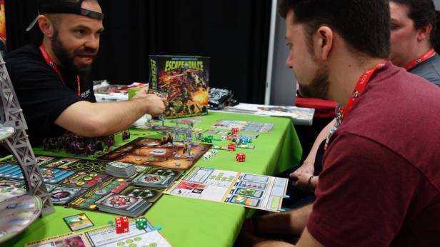 I went around to most of the new and upcoming games at the Tabletop Indie Showcase, and visited any booths I had my eye on but hadn’t had time before, such as Floodgate Games, Foxtrot Games, and Skybound Games. We also had a really fun demo experience from Craig Sawyer at Sentient Cow Games, playing the D&D-like sci-fi RPG Escape from Dulce.
