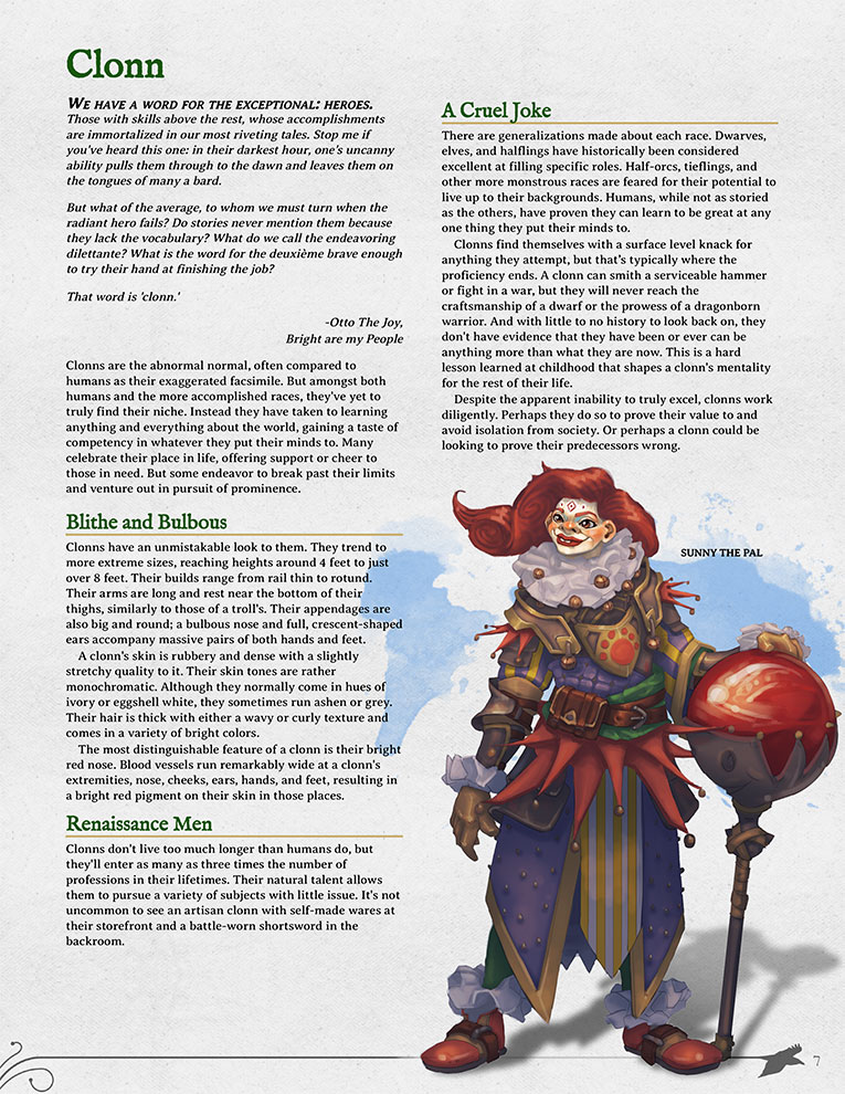 - Five new subclasses and four player races, including a very detailed explanation of the Clonn race (along with five Clonn-specific Backgrounds).