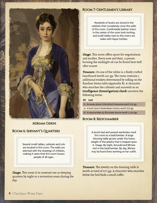 “The Great Wyrm Theft” is divided into three parts with part one detailing the mission and adventure background, part two providing the room-by-room layout of the mansion, and part three explaining the NPC attendees as well as a helpful timeline of events.