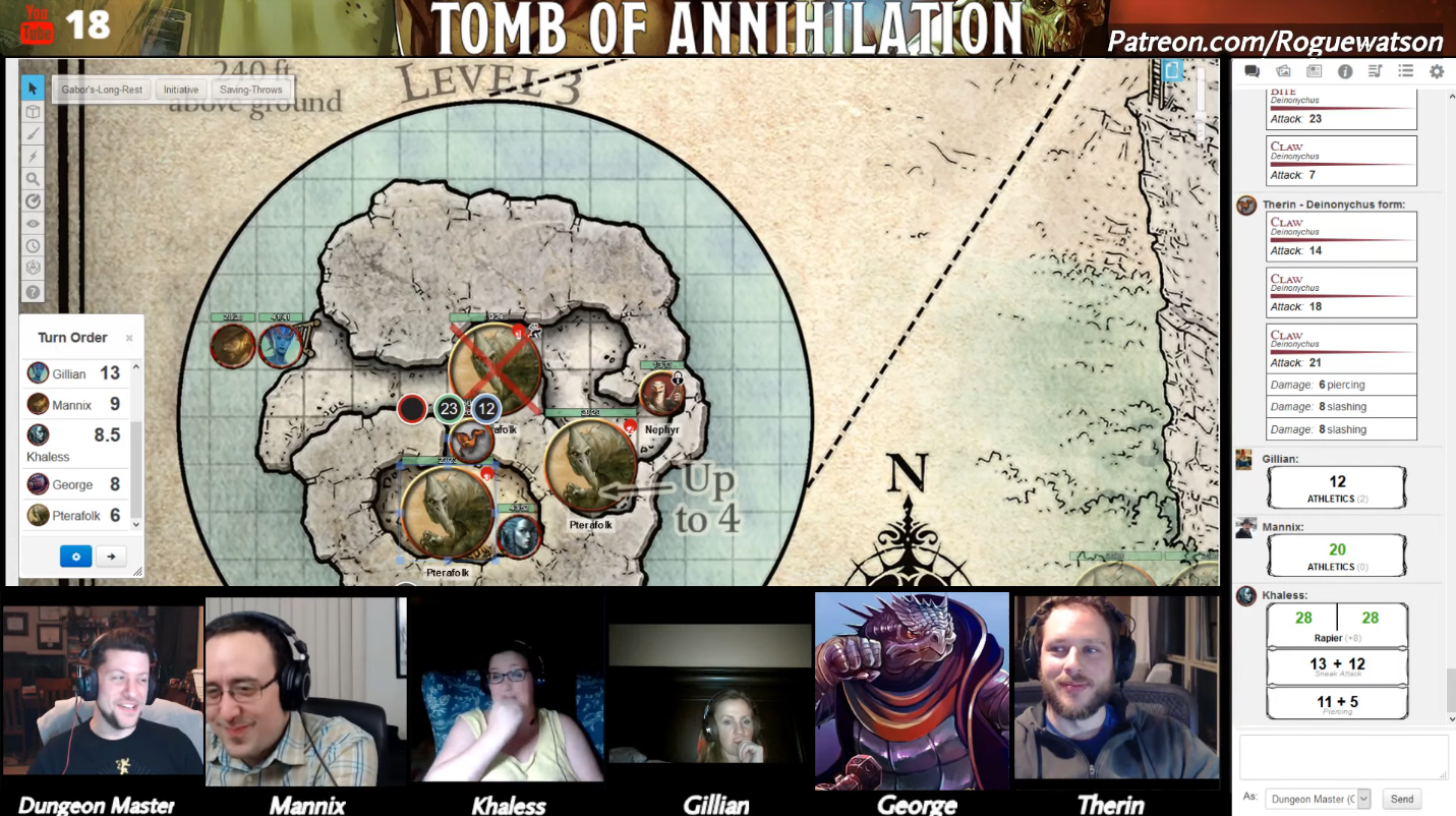 The others poured up the ladder, with Khaless destroying the pterafolk by the fire in a devastating crit. The last pterafolk emerged form the back of the cave and launched into Therin-dino, but the others were able to quickly down it with a volley of melee and ranged attacks.