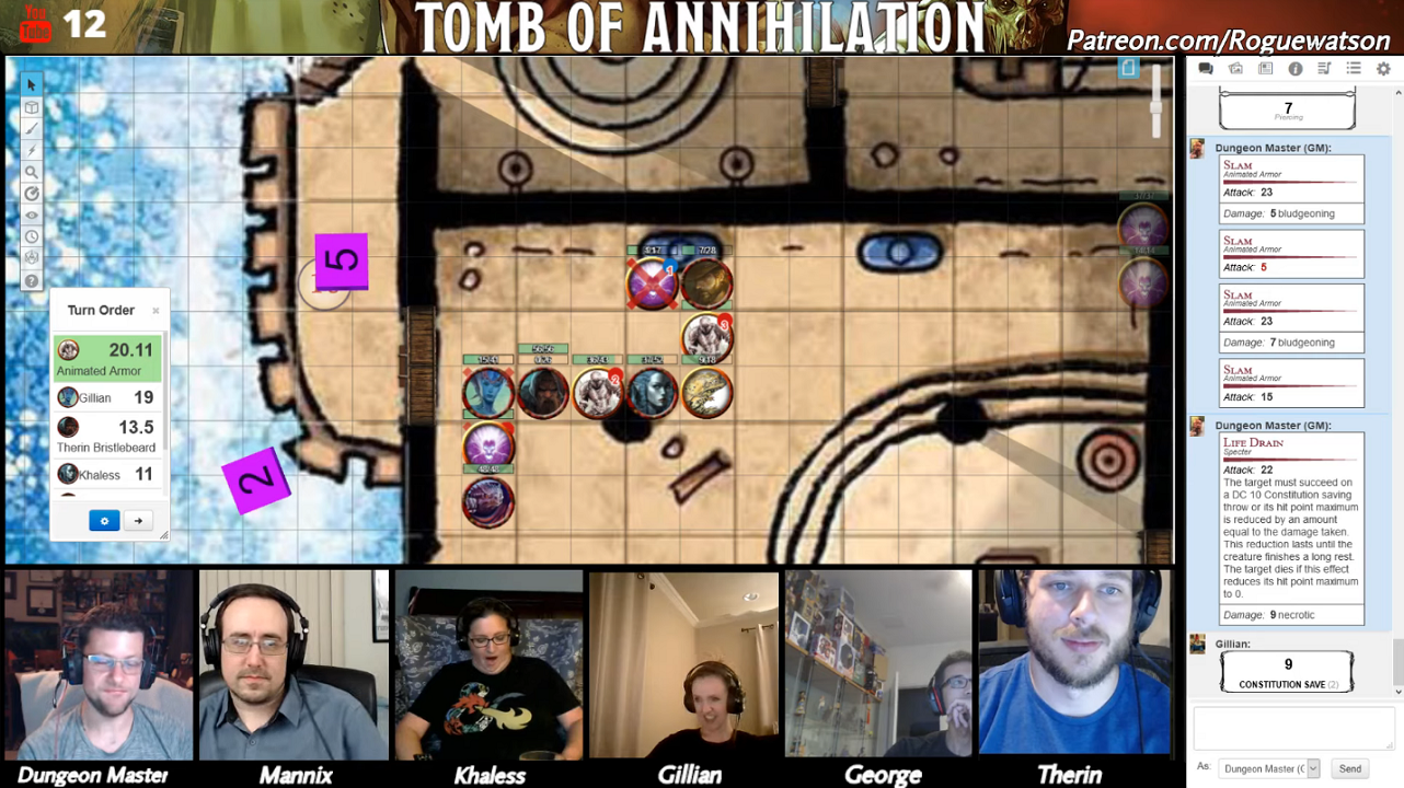Animated Armor are only CR 1, a relatively easy foe for a party of level 5 PCs. The CR 5 wraith is a bit stronger and caused Gillian some headache with its powerful Life Drain attack. The wrinkle in this fight was that each spirit was still inside the armor, spawning a CR 1 Specter every time an Armor was defeated. Both Mannix and Gillian would take some severe damage in this fight (with Gillian having to cast healing spells), but ultimately the party prevailed.